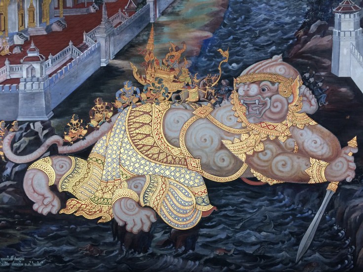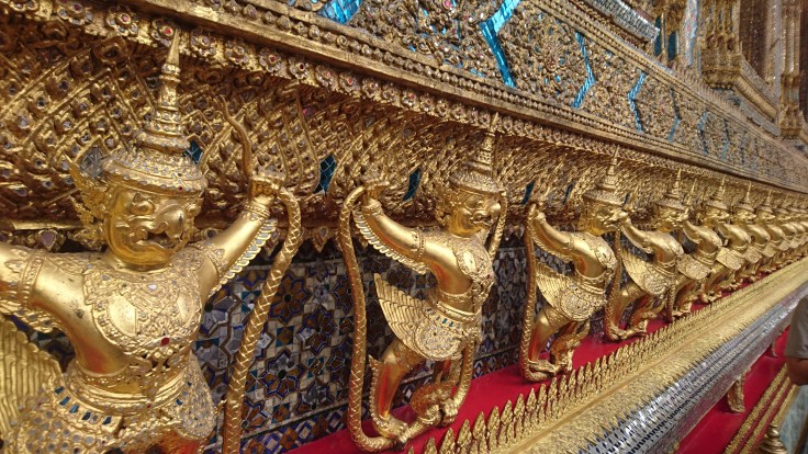 The next morning after off and on sleep we had a day of sight seeing when we went to the Grand Palace and Emerald Buddha (Wat Phra Kaeo) and Reclining Buddha (Wat Pho) Temples. The first complex was built in 1782 and is dripping with gold everywhere you look. We were particularly impressed with the wall murials and loved the dog statues (as we would).