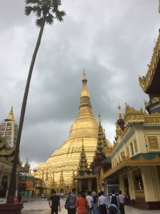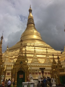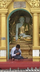 The site itself is dripping with gold as you can imagine. The pagoda itself is incredibly impressive at 90m tall and there is a second smaller pagoda also there. Then there are a multitude of temples around the outside of the main pagoda. Architecturally, aside from the pagoda itself, the palace in Bangkok is more impressive. However, that is a pure tourist site and is thronged with people all day long. We did go on a Monday (oddly we have US labor day as a school holiday here) but the atmosphere was altogether different and much more pleasant. I counted 5 other western tourists at the site. My guess would be that 90+% of the visitors were Burmese and I would say around 40% were actively engaged in some kind of worship. This makes the whole experience feel a lot more like you are visiting an active shrine than a tourist attraction. There were some interesting moments when we saw a monk taking a photo with his camera and also someone sitting in a shrine glued to his phone.