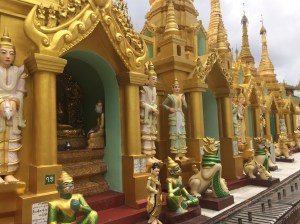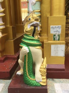 We approached from the north stairs as we are north of the site and I guess the taxi driver thought that would be easiest. There are 4 sets of stairs for each compass point and then a series of corners inside with days of the week. You are supposed to pour water on the statues under your day. Lindsey’s (Friday) was some kind of rat or possibly a mouse. It costs 10,000 Kyats (pronounced ‘chat’) to get in which is about £6.00. The largest note in Myanmar is the 10,000 Ks. note which is a bit crazy. We have frequently got 200,000 Ks (about £110) out of the ATM only to find it coming out in 5,000 Ks. notes which are worth about £2.70 each!