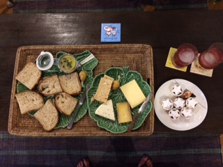 Update!  We did decorate.  We found cranberry sauce in a can and managed to make our traditional Cranberry G&Ts.  Snack tray (with mince pies!) pictured above.  Here we are post-decoration, Nell thrilled to pose as usual.