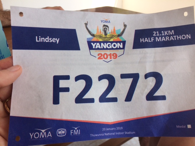I have been up since 3:20am because I ran the Yangon Half Marathon this morning. Some colleagues from school have run it before and assured me that the timing of the race meant that the weather would be decent, the course route is interesting and it is well supported with drinks stations ever 2.5K. I decided to sign up even though I am not in great shape for distance running at the moment. Gone are the days I could just bang out 13 miles on a Saturday, I have no desire to fight the weather that much here in Yangon. I just figured at worst I could walk it and it would be a good challenge. Also the gun goes off at 5:30am so you don’t even waste a day doing the race. I have to say that I was very impressed with the organisation of the event-everyone got personalised bibs! With your emergency contact info already filled out on the back! Fancy. Three of us who live on the same road cabbed over the stadium this morning and got ready to race.