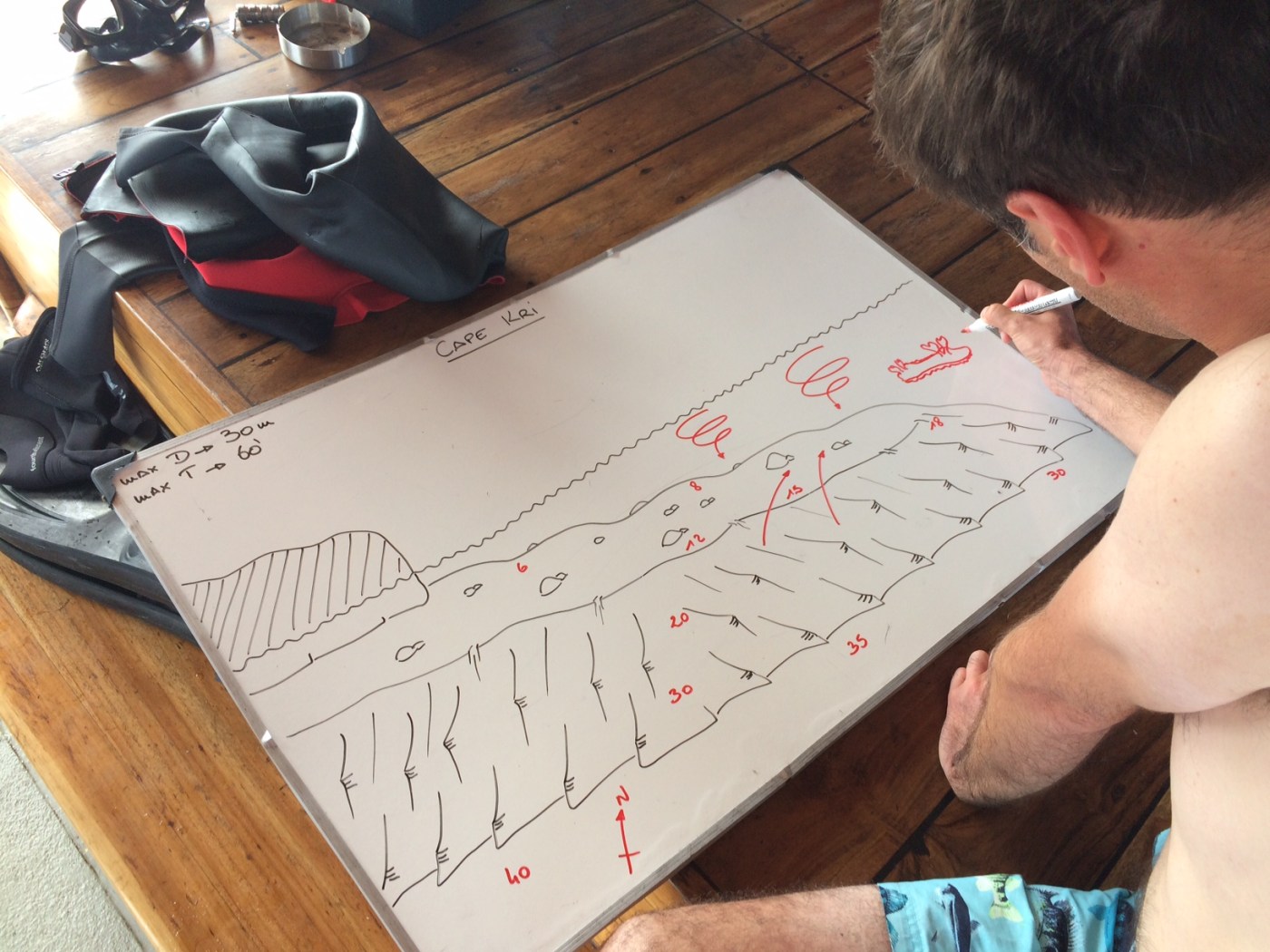 Before each dive, there was a quick briefing with a hand-drawn map of the reef and some indications of where we might meet current, etc.  Gav started to “enhance” these drawings while the guides were off the boat checking the current-first it was Santa in a canoe on Christmas day and then random drawings of things we wanted to see.  See photo above with Gav adding a nice Nudibranch.  I’m not sure how much these additions were appreciated, but they were probably appreciated more than the signals that we made up for different fish and then forced our guides to use to point things out. Of particular note was a signal involving some high elbow movements that meant “frog fish.”  The guides rolled their eyes at us, but they did use them for us which was hilarious.