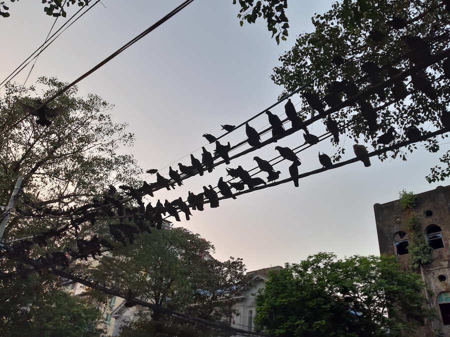 In Yangon you can sometimes find people selling food to feed the pigeons rather like they used to do in Traflalgar Square in London. This means that they congregate in large numbers on the electricity wires in those places.
