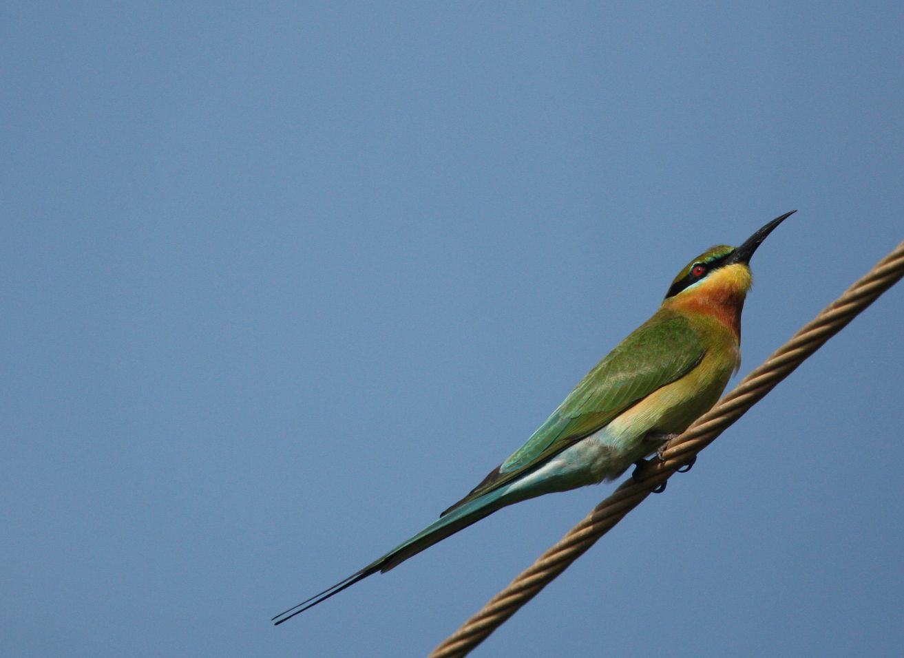The Blue-tailed Bee-eater is larger than his smaller cousin and more common.