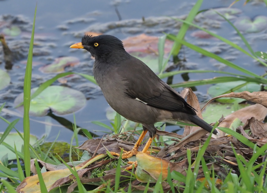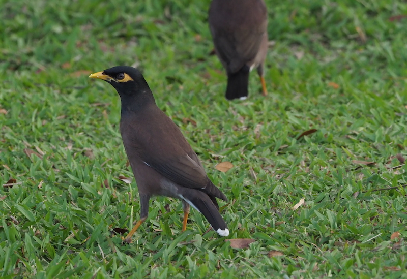 The other Myna commonly seen in Yangon is the Jungle Myna, although I note that the other option, the White-vented Myna, is also seen in cities. They both have a sort of crest coming from the base of the beak but the big difference, other than the call, is that the Jungle Myna has a dark bill which is half yellow whereas the White-vented’s bill is all yellow. The Jungle Myna is distinguished from the Common Myna by its more charcoal colour and crest.