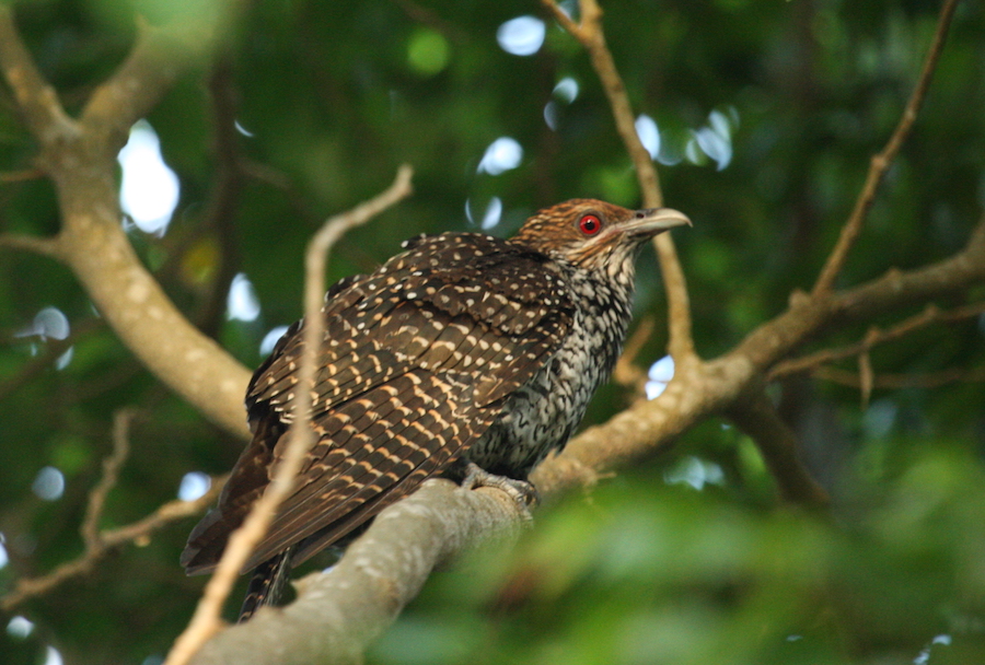 This bird, though rarely seen, is one of the most known birds in Yangon. The reason is that it has a very distinctive call. In Burmese the word for this bird is something like ‘Oh Aah’, which is akin to the noise it makes. In fact it has quite a range of impressive noises and I will try to record them for this post. The reason for its seeming elusiveness I think is that the male looks not dissimilar to the House Crow, which, along with the Tree Sparrow, is probably one of the most common birds in Yangon. So, if you hear it and look up you might think that what you are looking at is a crow when in fact it isn’t. Look closely and you’ll see it has a red eye and long tail. The female is vey pretty but completely different being a light brown colour with bars all over. One of the few occasions when the female outshines the male. The below shots were taken in Sri Lanka.
