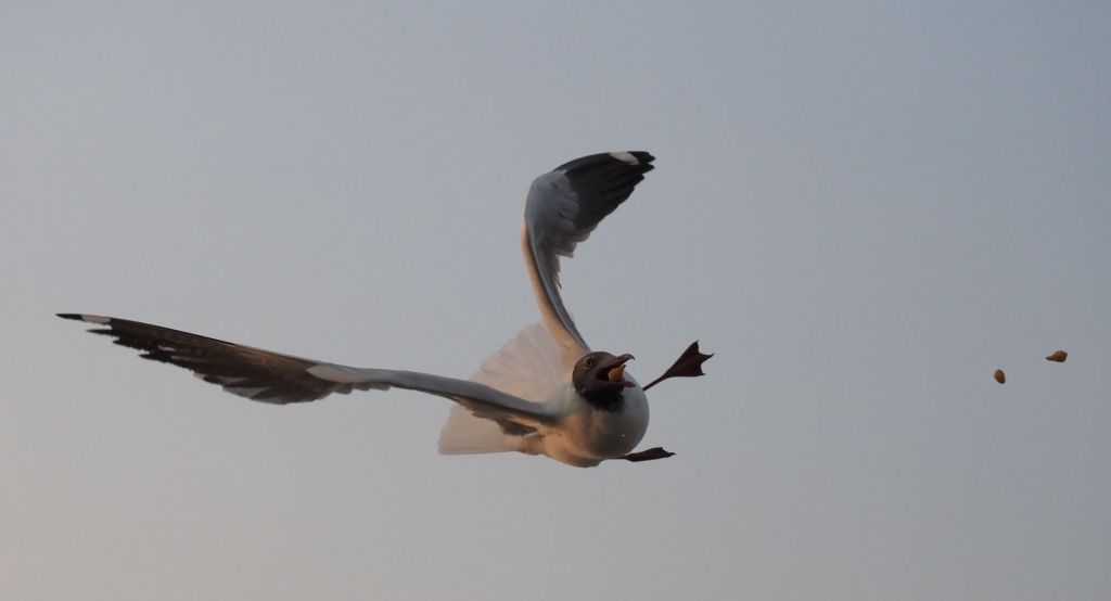 Take a trip on a boat from the harbour in Yangon to see the sunset and among other snacks you might be given a bowl of small round yellow crispy things. After tucking into them we were politely informed that these were for the gulls! This is the Brown-headed Gull. Like the black-headed gull you see in the UK, it only has a brown head when in the breeding season. Other than that you can just see a spot of colour behind the eye.