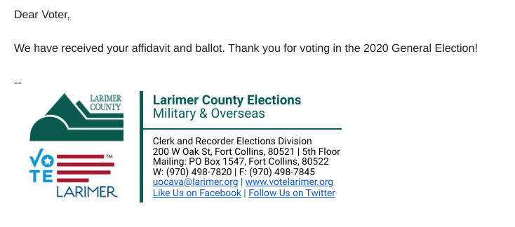 I did my civic duty and voted from abroad! I am a newly registered voter in Colorado as my parents have moved there. Colorado has a very easy email voting system and I got confirmation that my vote had been processed.