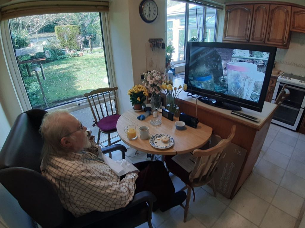 Considering his extremely poor eyesight and general condition, Dad was quite able to follow what was going on on a television program or film which I found quite surprising. He was pretty sharp during that month. I was keeping a list of all the different species of birds I’d seen in the garden. As I was awake much earlier than him there would often be a new bird to report when he got up. I would tell him that there was a new bird when he got to the stairlift and he would have the (tortuously slow) journey downstairs to guess the bird. After about 15 birds we had a greenfinch which is unusual for that garden and amazingly, he got it in one. Dad always loved birds which is where I get my own interest in them. Although I gave bird cam presents to my brothers I never did it for my Dad because of his poor eyesight. I thought he’d never be able to see the birds. Soon after arriving I discovered the location of a Robin’s nest in the garage. Being pretty experienced in setting up bird cams I figured it would be possible to manage for this one although it would involve some messing around and a 40 meter cable! I ordered all the parts and soon had it going on the main television. The problem was that Dad spent his day in the kitchen and was not able to move easily between the two rooms. The next day I decided to up the game and brought another television right into the kitchen. This was unprecedented for Dad and had the additional horrors or cables stuck to the walls with masking tape! I had it all set up for when he got up one day and was pretty nervous he would make me take it all down. Instead he loved it and we were glued to watching the Robins feeding their chicks every day. We even watched as one left the nest – a total success!