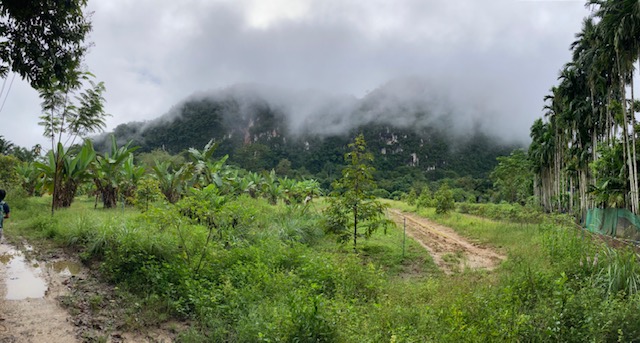 Later in the morning we went to Khao Sok national park, a foray which ridiculously involved us having to prove that we were double vaccinated to….walk on some nature trails outside. ALSO we had to pay to enter the park (fine) at a kiosk that was manned by two people. There was a ticket machine, but you could not put the money in yourself, you had to hand the money to one of the guys who would put it in for you. Except the machine had no change. And also it did not accept 500 bhat notes (the charge for 2 of us was 600) and all we had was a 1000 bhat note. So we had to go through a long rigamarole of the two men getting change for our 1000 note in a till and then feeding the money into the machine, which spit out a ticket that they handed to us. And then took back from us. Unbelievably this was slightly smoother than the next day when we returned without our guide and tried to do this ourselves, only now we had to pay for marking which involved coins and….never mind we made it in the end.