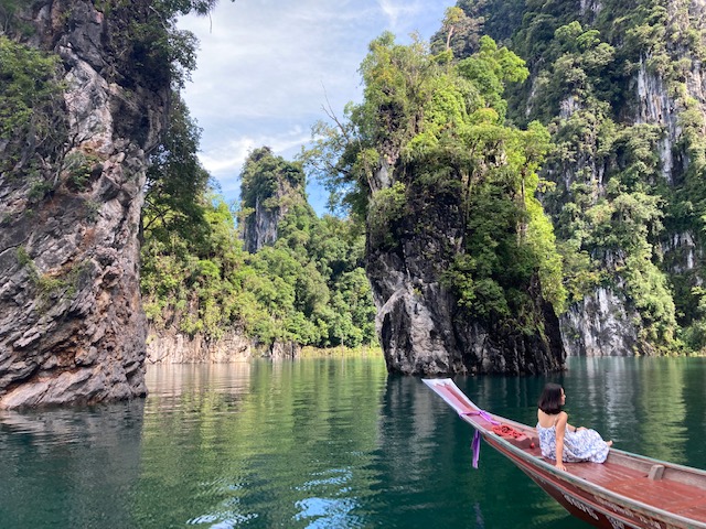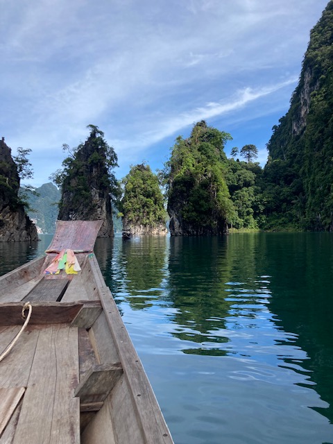 The third morning we left the treehouse to go on a little adventure on a man made lake. This giant lake got dammed up in 1987 to create a reservoir, purposefully flooding a valley surrounded by limestone cliffs. You take a long tailed boat around the different nooks and crannies to sightsee, and if you want you can spend the night in a floating house on the lake. The boat ride was stunning and we got to see a giant colony of fruit bats (the really enormous ones) on one of the islands. An eagle flew past at one point, spooking the colony and they all flew from their perches even though it was in the middle of day!