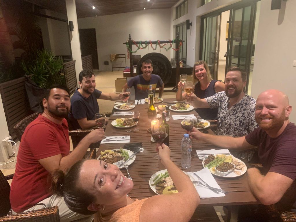We had all of our colleagues who are living in Phuket over for a belated Thanksgiving feast. I had been looking at the local supermarkets for a turkey to cook, but the prices were outrageous ($150 for a 10 lb. bird, which was weirdly already cooked but also frozen? No thanks). So Gav and I decided to get a few chickens and cook those instead. Everyone else brought sides that they wanted and we had a pleasant and very delicious (if way sweatier than normal) Thanksgiving dinner.