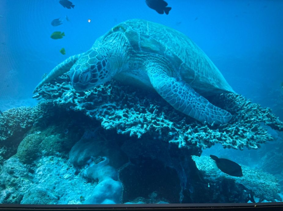 The diving in general was great although there were two particularly good dives. The first was a site called Turtle City and it turned out to be aptly named. There were turtles everywhere. Some were sleeping on corals others just swimming about. One had a shell that was at least 3ft long I would say which was probably the biggest turtle we’ve ever seen. The other dive site was called Manta Point and as it was apparently manta season, we also got to see loads of manta rays. This site is a large area where mantas come to get cleaned by smaller fish. The coral, however is all broken which means that there isn’t much to hold onto. Typically, when you see manta rays, you hook on to a rock so you don’t have to swim against the current. Then you and the manta hang out. As there wasn’t too much to hook into, the first time we were hooked into one rock and then all three of us were holding the rope in quite an awkward fashion. I was closest to the rock and hook so had the best view of this one manta that we had a great interaction with. It started out ahead of us maybe 20 feet away. Then it slowly backed up and passed in front of us. When it did this I would say its tail was less than a foot away from my face. I actually wondered whether there was any sting in a mantas tail – it turns out there isn’t. Then it stopped about another 20 feet away from us to our left but parallel to our position. Mantas can be quite curious creatures. Slowly but surely it started to move closer to us and eventually was so close I thought it was going to brush my cheek with one of it’s ‘wings’. It didn’t but it was only a few inches away. After that it slowly moved away. Overall a fantastic experience.