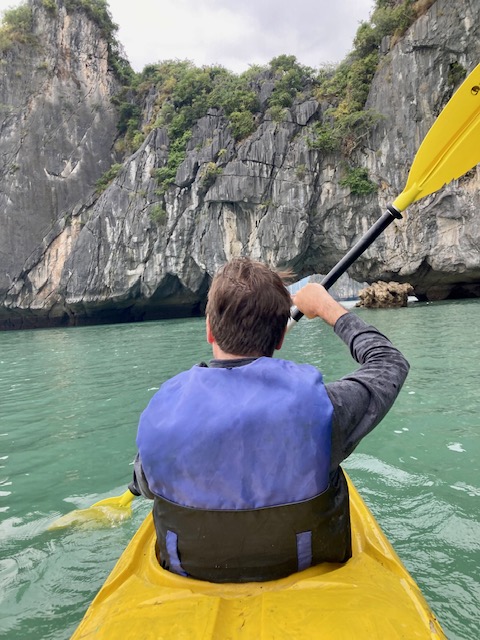 Look at Sporty Gav up there. He complained the whole time we went kayaking, which was really the only time we were warm- From the effort of paddling and because the water was weirdly warm. We saw lots os 20-somethings swimming and actually if you could have stayed in the water forever you would be fine, it was the idea of getting out of the water that really put the fear of god into you. In any case, highly recommended to take this option if you want to explore Halong Bay as you are on your own and not with a million people on a big ship. The boat’s name is Little CatBa and it’s on Airbnb. Just don’t go in December!