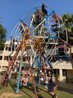 We also managed to cram in the last of our school (outdoor) events before the weather turned. One of the biggies every year is the Family Fun Fair. This is an event run by student council that raises money for organizations that the school supports. There is an entry fee and then you buy tickets to do certain things like play in the bouncy castle or, Gav’s personal favourite, ride the human powered Ferris Wheel. The Ferris Wheel is legendary, and kind of the symbol of the Fun Fair. It’s the main thing students remember year on year and the love to ride it and scream. To first timers this thing looks like an absolute death trap as it is powered by many men climbing up it in flip flops and then using their body weight to swing it down and around, leaping off at the very last second before the car behind them bashes their brains in. Gav is terrified of an accident happening but every one else loves it. Just to annoy him I signed up for Ferris Wheel duty which basically meant helping the guys who ran it load the cars so that the weight was evenly balanced. This meant that sometimes parties got split up. I had a 7th grade boy have to ride with a 2 year old girl he didn’t know tucked under his armpit (there are of course no seat belts, you are just instructed to “hang on tight.” He looked at me with terror in his eyes and said “what do I do if she cries???” She was totally fine, he shrieked the entire time.